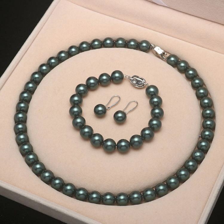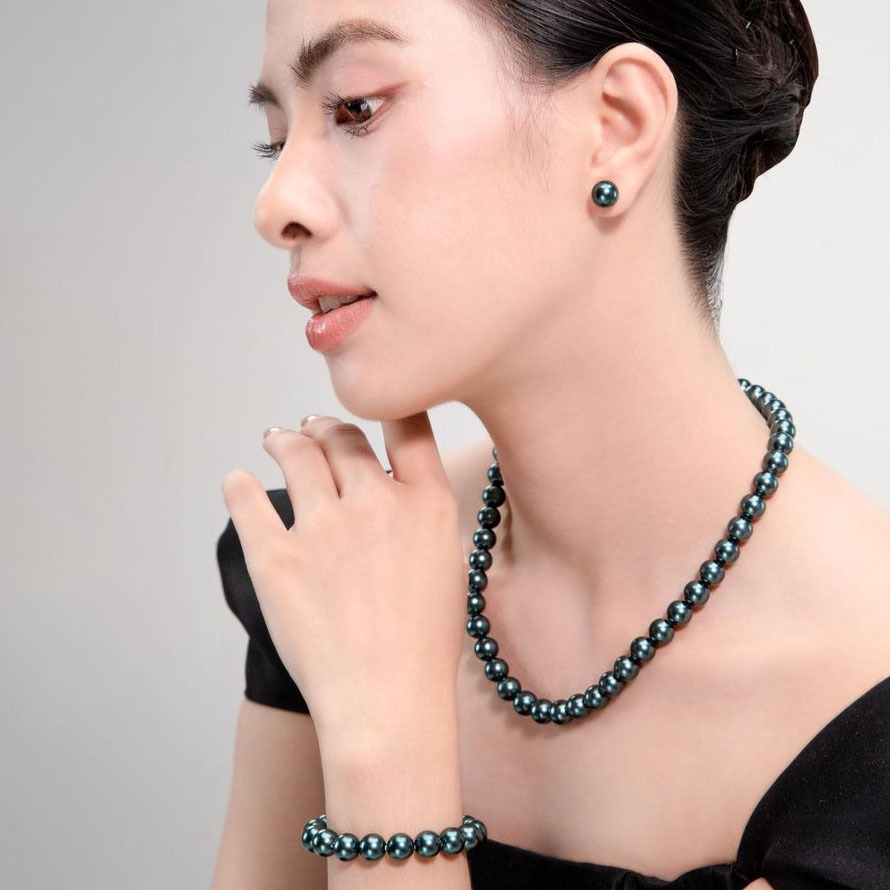 Với kích thước viên ngọc 10mm đồng đều, bộ trang sức này thể hiện sự cân đối hoàn hảo giữa tinh tế và sang trọng. Khi ánh sáng chạm vào, từng viên ngọc phản chiếu những gam màu xanh lục, tím than và ánh xám huyền ảo – một bức tranh màu sắc tinh tế được thiên nhiên vẽ nên qua hàng năm tháng.